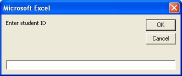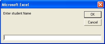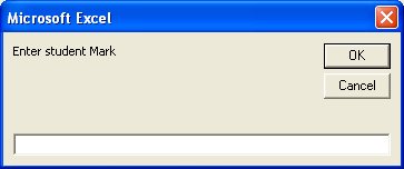 StudentName(i) = InputBox("Enter student Name") StudentID(i) = InputBox("Enter student ID") StudentMark(i) = InputBox("Enter student Mark") Cells(i, 1) = StudentName(i) Cells(i, 2) = StudentID(i) Cells(i, 3) = StudentMark(i) Next End Sub