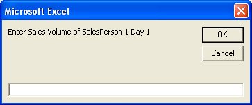 SalesVolume(SalesPerson, Day) = InputBox("Enter Sales Volume" & " SalesPerson " & (SalesPerson - 1) & " Day " & (Day - 1))